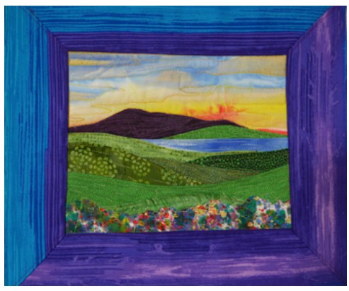 Here’s another surprisingly simple quilted scene using Karen’s layered topstitching technique. Gentle rolling hills of green fabric strips combine with distant peaks to create peaceful vistas. Include a lake or a field of wildflowers. The variations are endless! You will also learn how to embellish the landscape with beads, yarn and Angelina fibers to give it sparkle.