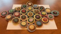 A 12” block uses 15 “potato chips”; an 8” block uses 8 “potato chips, your choice. Bring enough chips for however big you want your quilt. Half should be light and the other half dark or dark medium. I encourage you to make up baggies of 10 light/10 dark to trade with others to really make it scrappy.